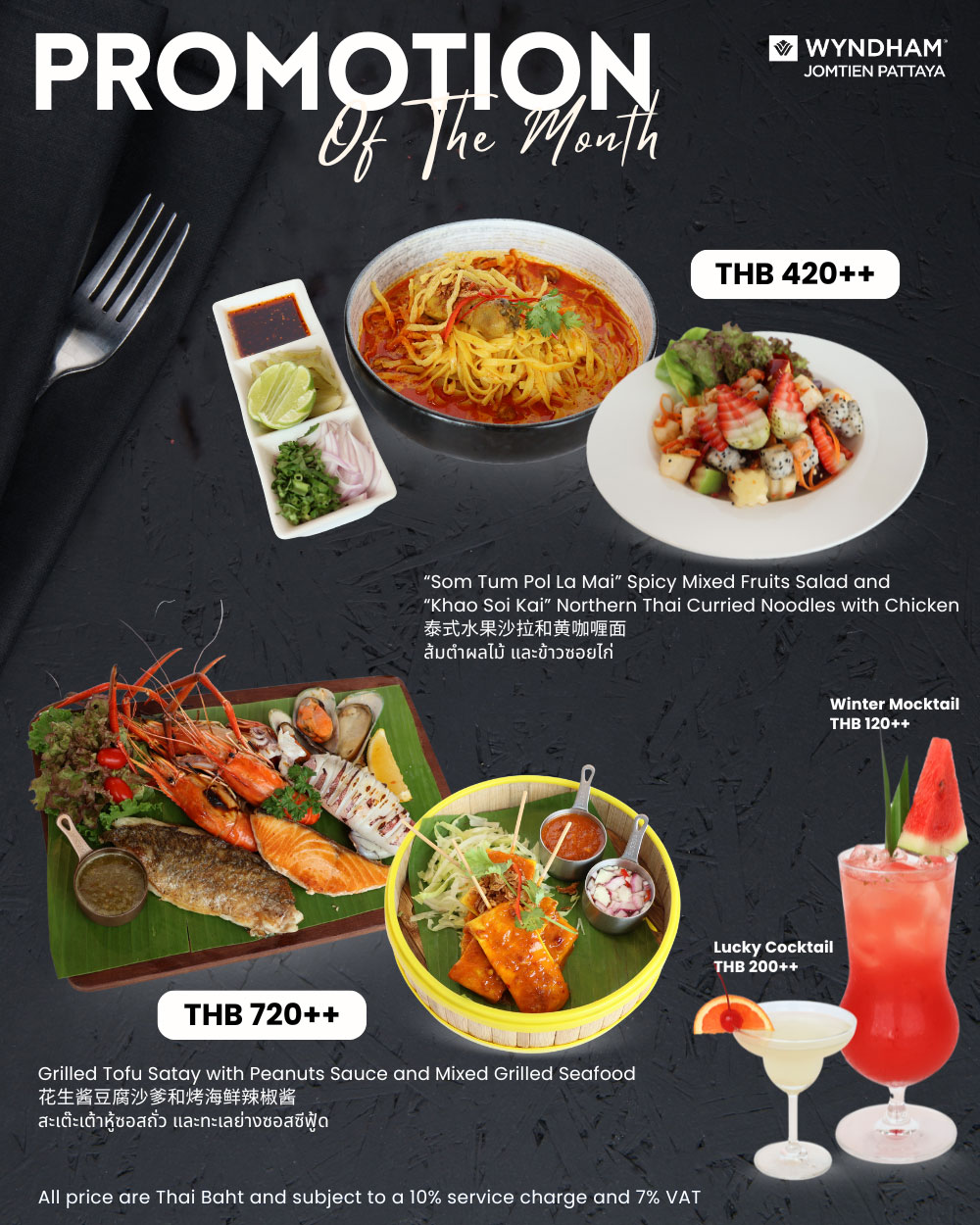 Experience the taste of Thailand at its finest 🇹🇭 From refreshing Spicy Mixed Fruits Salad and creamy Khao Soi Kai, to our flavorful Grilled Tofu Satay and premium Mixed Seafood Platter. A perfect meal awaits you at Wyndham Jomtien Pattaya