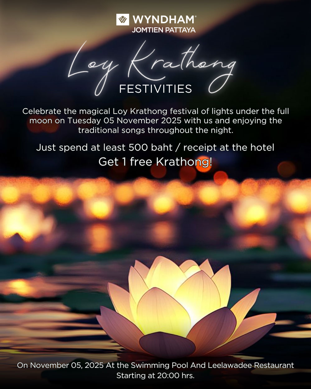Loy Krathong Festivities Celebrate the magical Loy Krathong festival of lights under the full moon. Just spend at least 500 baht / receipt at the hotel Get 1 free Krathong! On November 05, 2025 At the Swimming Pool And Leelawadee Restaurant Starting at 20:00 hrs.